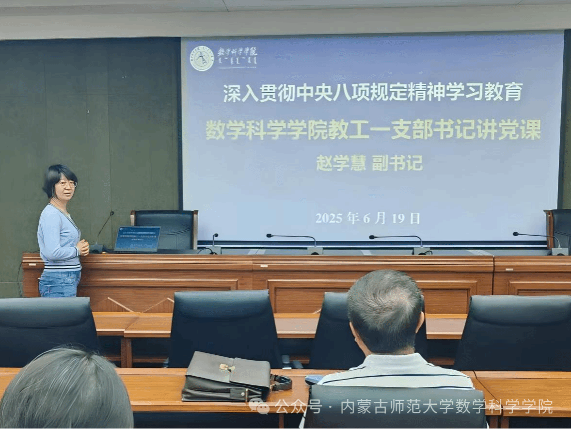 教工第二党支部副书记萨和雅结合乐竞体育-中国一站式服务官网实际讲授专题党课。党课剖析了教学、科研、管理等重点领域在日常工作中可能存在的廉政风险点,强调要加强监督,完善制度,防范“四风”问题反弹。要求全体党员增强自律意识,筑牢思想防线,坚决抵制不良风气,将作风建设融入人才培养全过程,培育兼具专业素养与高尚品格的新时代数学人才。