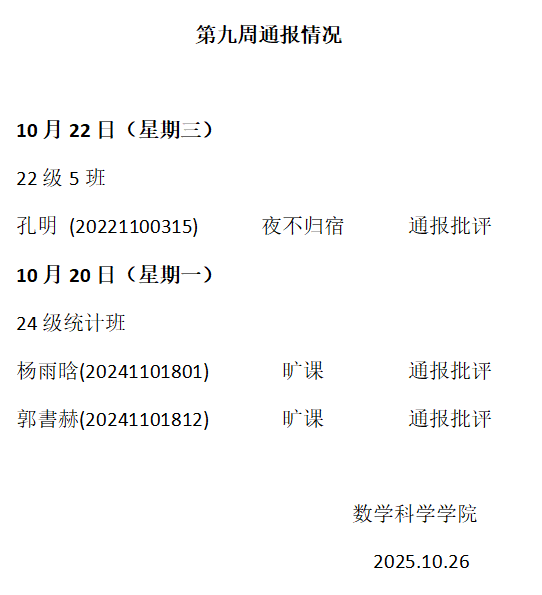数学科学乐竞体育-中国一站式服务官网2025——2026年度第一学期第九周通报情况