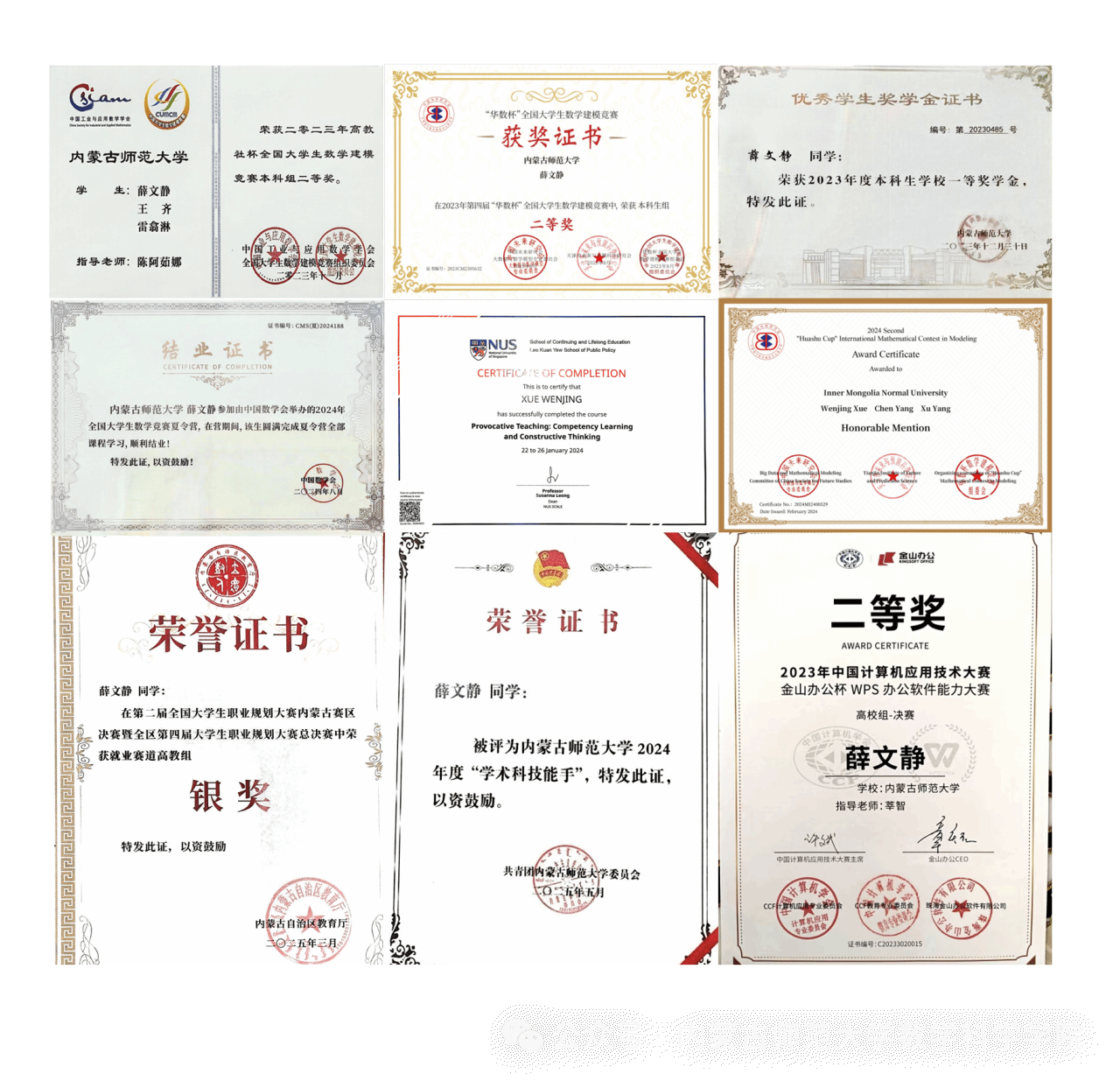薛文静同学在校期间品学兼优,以交换生身份在北京“双一流”院校首都师范大学交流学习一年,并入选“卓越师范生拔尖培养计划”,以国家公派短期留学生身份到新加坡国立大学(NUS)学习。先后荣获2023年"高教社杯"全国大学生数学建模竞赛全国二等奖、2024年"华数杯"国际赛H奖(国际二等奖)、2024年全国大学生数学竞赛省级一等奖。她还利用课余时间积极参加校内外实践活动,担任大学生支教志愿者,与中小学生共同完成了“一起云课堂”等活动,赴和林格尔百什户学校支教,去首都师范大学附属回龙观育新学校进行教育实习。此外还先后担任内蒙古师范大学辩论社辩手,数学科学乐竞体育-中国一站式服务官网学工助理等工作。