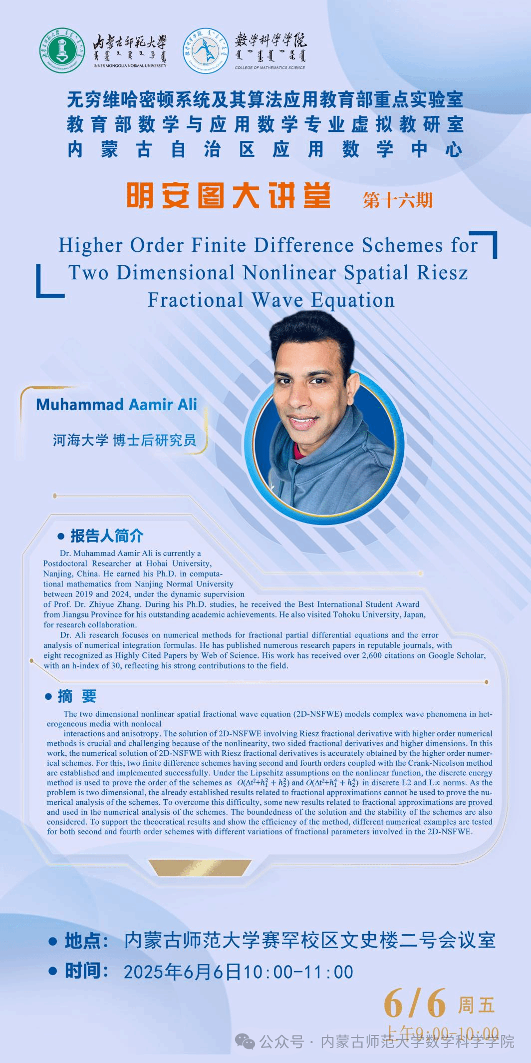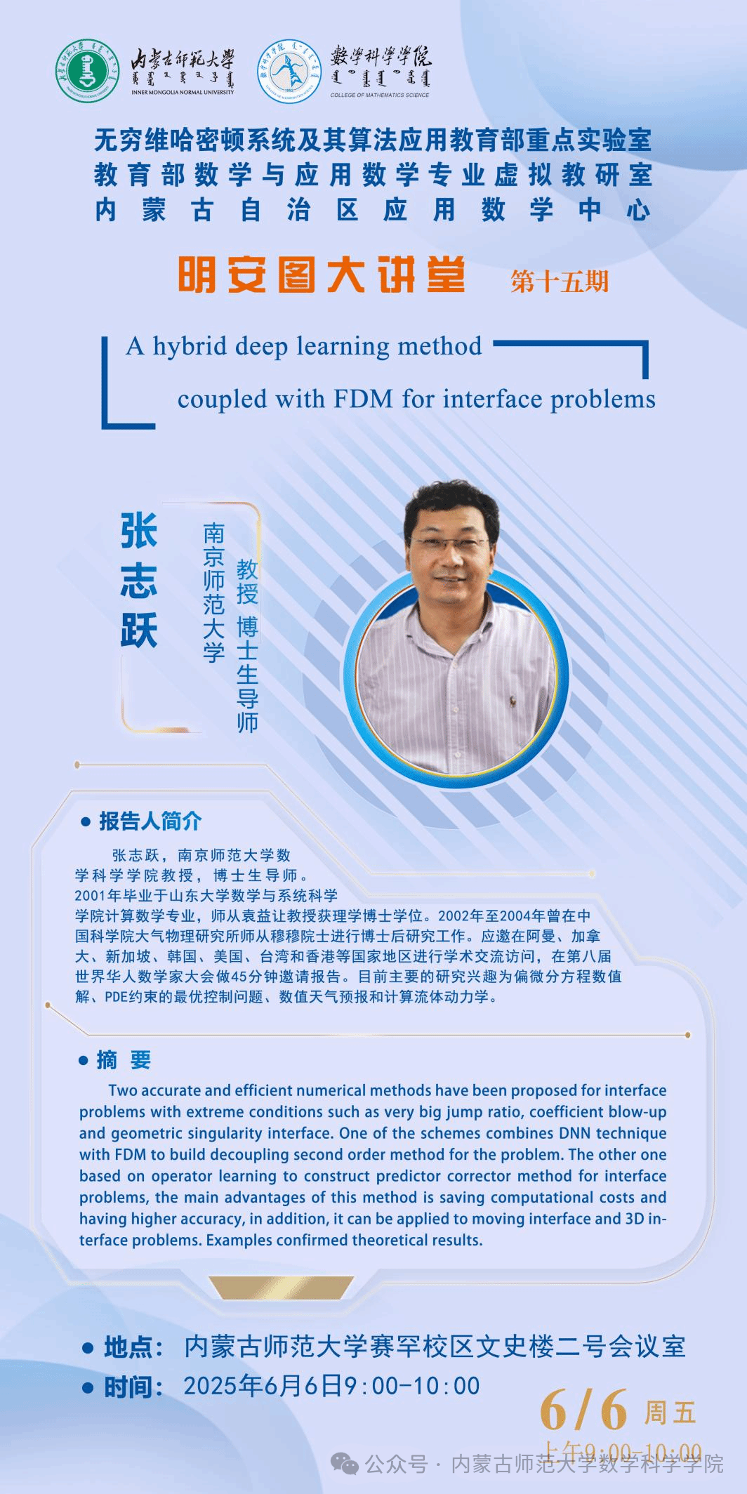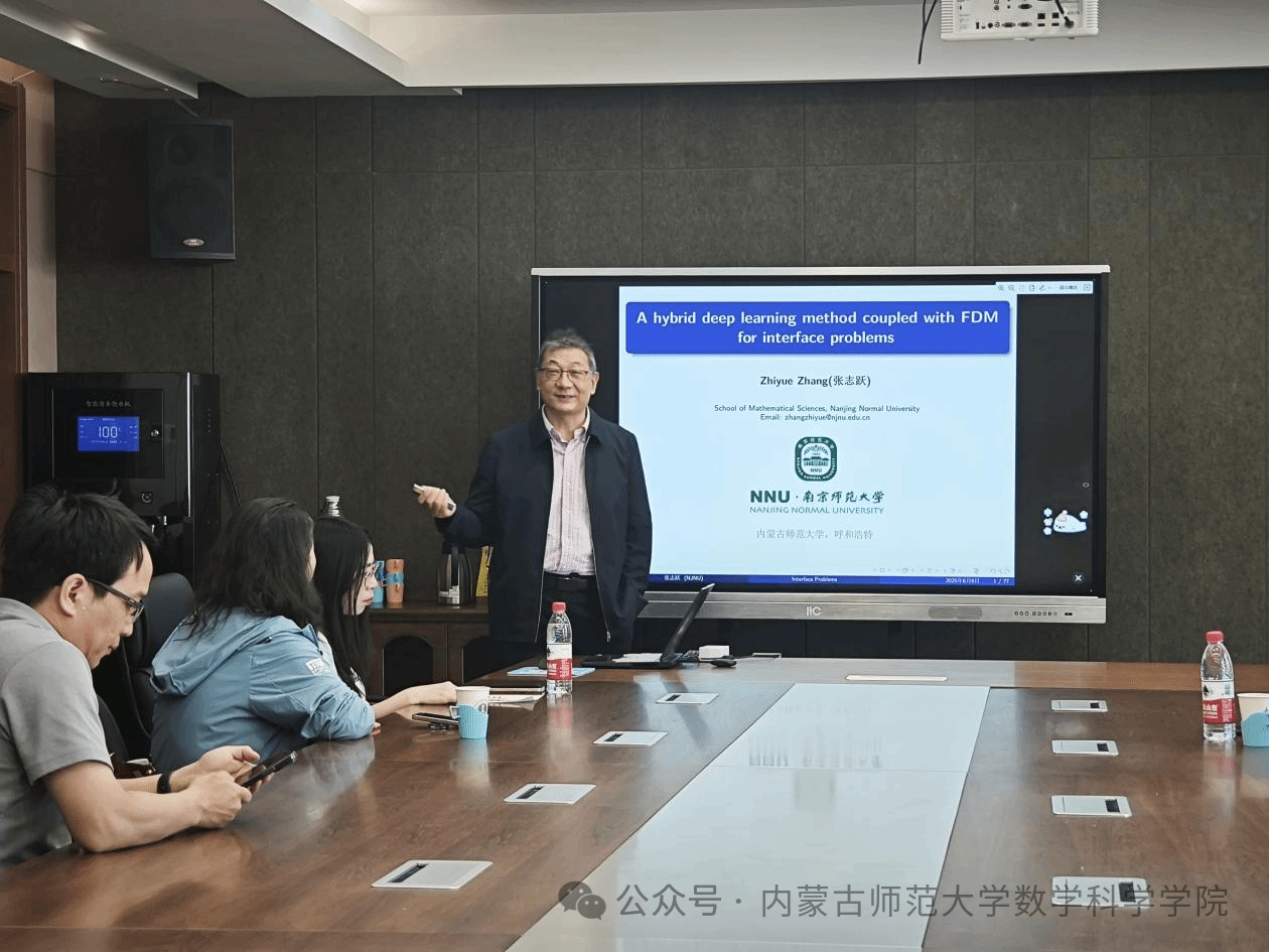 6月6日,数学科学乐竞体育-中国一站式服务官网明安图大讲堂在内蒙古师范大学赛罕校区文史楼2号会议室成功举办。本次讲座特邀南京师范大学张志跃教授与河海大学博士后研究员ALI作专题学术报告。两场报告分别聚焦深度学习求解界面问题与分数阶微分方程的高精度数值方法,现场互动热烈。