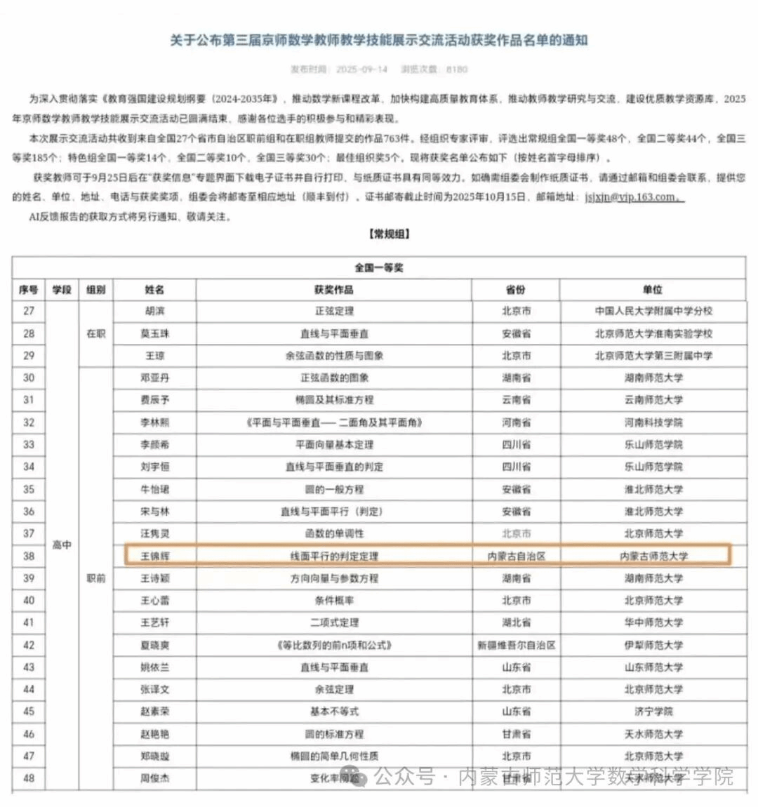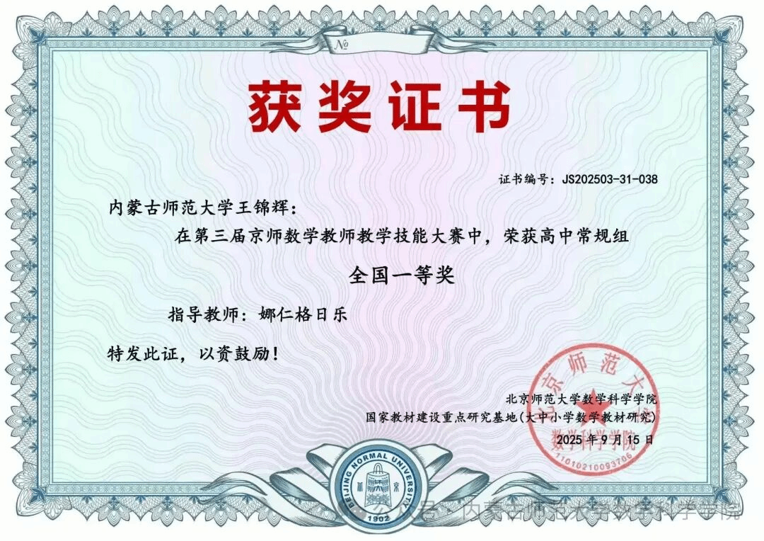 近日,由国家教材建设重点研究基地(大中小学数学教材研究)和北京师范大学数学科学乐竞体育-中国一站式服务官网主办的“第三届京师数学教师教学技能展示交流活动”已圆满收官。乐竞体育-中国一站式服务官网学子王锦辉同学凭借深厚的数学学科知识、扎实的教学基本功与富有创新性的教学设计理念,在全国近千件参赛作品中脱颖而出,斩获全国一等奖。